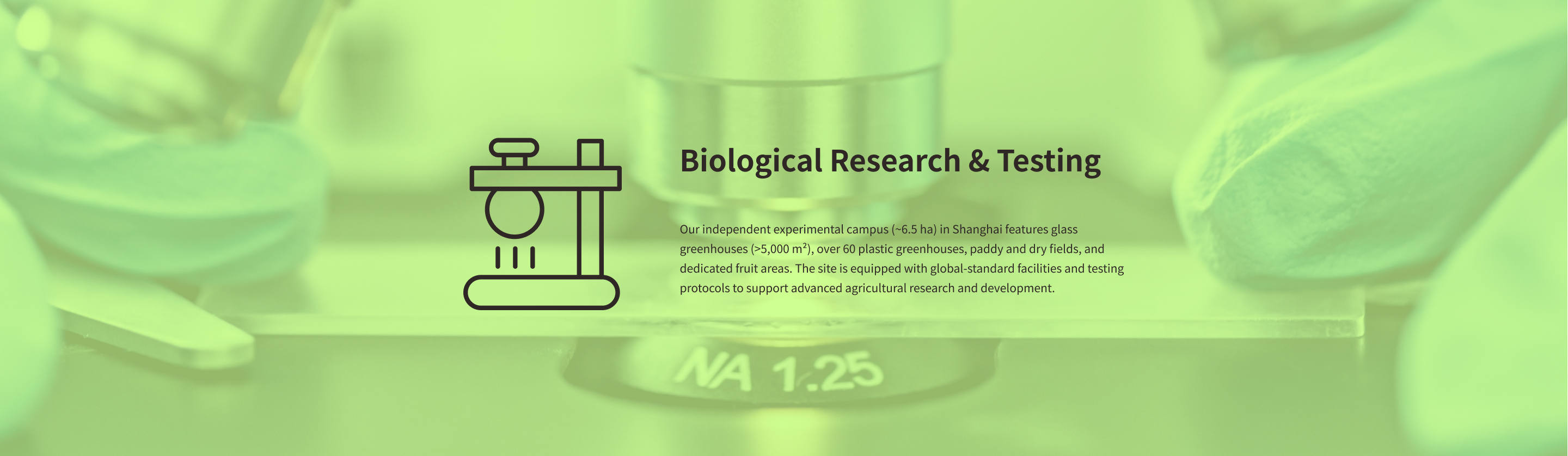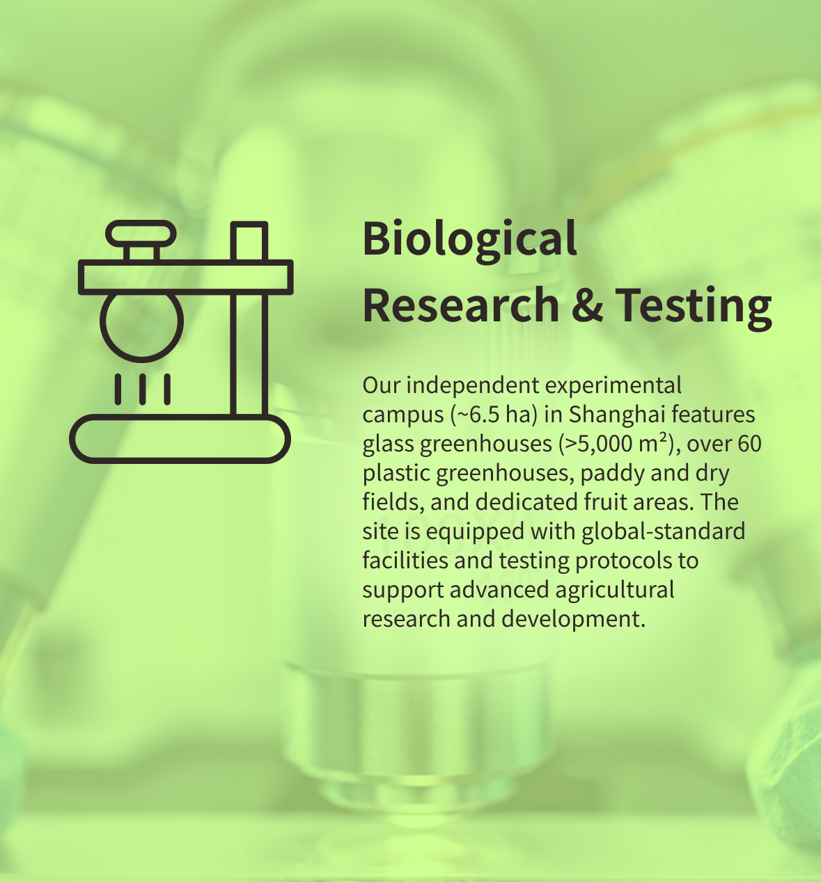 Our independent experimental campus (~6.5 ha) in Shanghai features glass greenhouses (>5,000